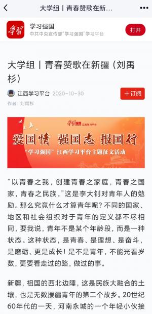 近日,在江西省委宣传部和“学习强国”江西学习平台组织开展的以“爱国心·报国情·强国志”为主题的征文活动中,统计学院18级5班刘禹杉同学的《青春赞歌在新疆》一文在大学组中脱颖而出,作为优秀作品代表荣登学习强国。