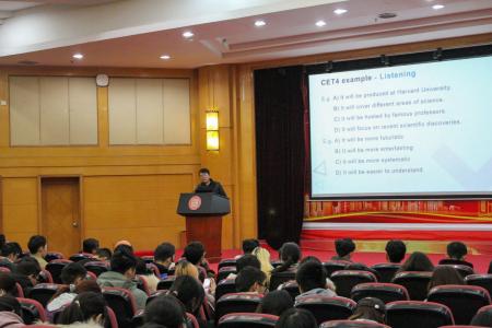讲座上,涂农老师主要从英语学习方法、四六级与托福雅思的考试对策以及出国留学注意事项三方面进行介绍。同学们聚精会神,认真地用笔记录下相关知识。中英转换之间,老师从直译、异译、美译等多角度层层递进,与同学们进行了现场互动。涂农老师从试卷的各部分剖析进击高分的实用方法,如多用词组代替单词、听力答题技巧口诀、阅读理解注重细节。“纸上得来终觉浅,得知此事要躬行 ”,同学们在了解了猜题、速记、速写等技巧后学以致用,快速地完成了经典例题。最后,讲座在同学们热烈的掌声中圆满结束。