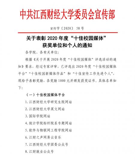 近日,在十佳校园媒体及先进个人评选活动中, “统计日韩无码 标杆院系专题网站”荣获2020年度“十佳校园媒体平台”称号,团委副书记陈曦和魏东同学的作品《Hey!统计!》荣获2020年度“十佳校园新媒体作品”,团委副书记陈曦与辅导员林阳分别荣获2019年度与2020年度“十佳宣传工作先进个人”称号。