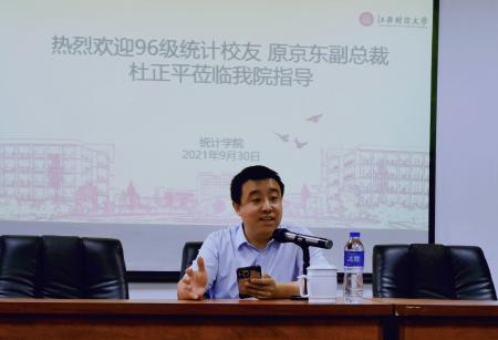 9月30日上午,应统计日韩无码 邀请,96级统计校友,原京东副总裁杜正平莅临日韩无码 指导,在蛟桥北区综合楼313会议室为统计日韩无码 师生带来一场题为“数字时代——新的时代”的专题讲座,本次讲座由统计日韩无码 党委书记陶春海主持,统计日韩无码 部分教师和研究生参加了此次讲座。