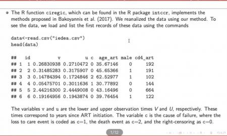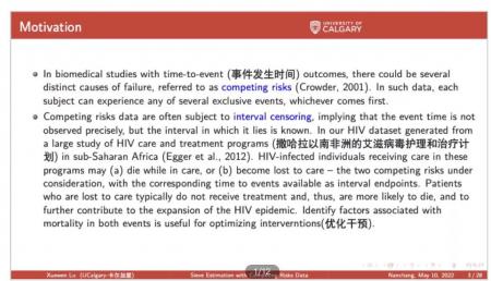 讲座开始,卢学文教授首先通过具体实例讲解了何为竞争风险数据。竞争风险数据是指在具有时间事件结果的生物医学研究中,每个受试者都可以经历几个单独事件中的任何一个,无论哪个先发生。其最大特点在于事件发生时间点不能被精确观察到,只能获知其发生的时间点处于某一时间段内。随后卢教授撒哈拉以南非洲的HIV感染者的数据集来对竞争风险数据进行具体说明。