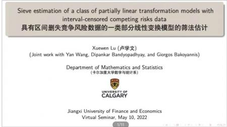 5月11日上午,应统计日韩无码 邀请,卡尔加里大学卢学文教授为统计日韩无码 师生带来一场题为“Sieve estimation of a class of partially linear transformation models with interval-censored competing risks data”的线上讲座。本次讲座由统计日韩无码 副院长刘小惠主持,统计日韩无码 部分教师和研究生参加。