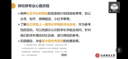 成功跨考上岸西南财经大学的彭雨洁给同学们讲述了关于自己跨考金融学的经历。她建议同学们在确定了自己跨考的决心之后,尽可能通过多渠道了解跨考专业的学科知识和就业前景,做好各个科目的学习计划,在劳逸结合中朝着目标坚定前行。